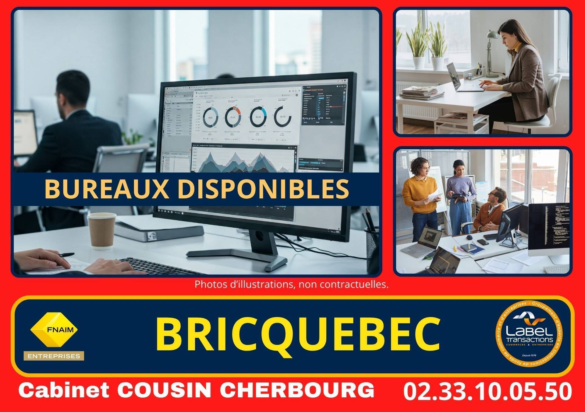 DEPT 50, A LOUER, nouveau BRICQUEBEC, rue de Bricqueville, BUREAUX A LOUER. Très belle visibilité. Possibilité 3 bureaux open space, sanitaires accès PMR. Libre début 2026. Loyer 950 euros + 100 euros (charges foncier et OM). Réf. 6837 Les informations sur les risques auxquels ce bien est exposé sont disponibles sur le site Géorisques : www.georisques.gouv.fr
