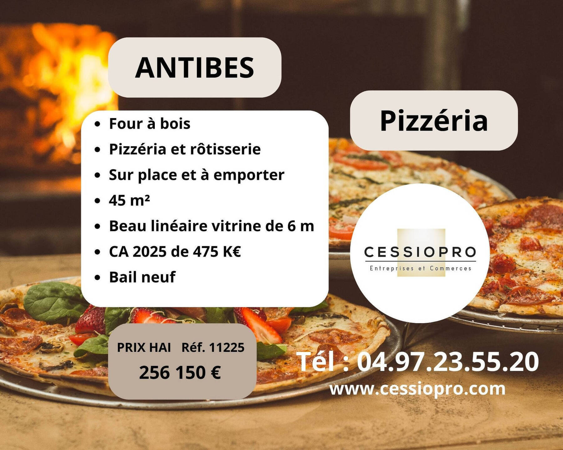 Antibes, pizzéria réputée, four à bois, sur place et à emporter, rôtisserie, bail neuf.