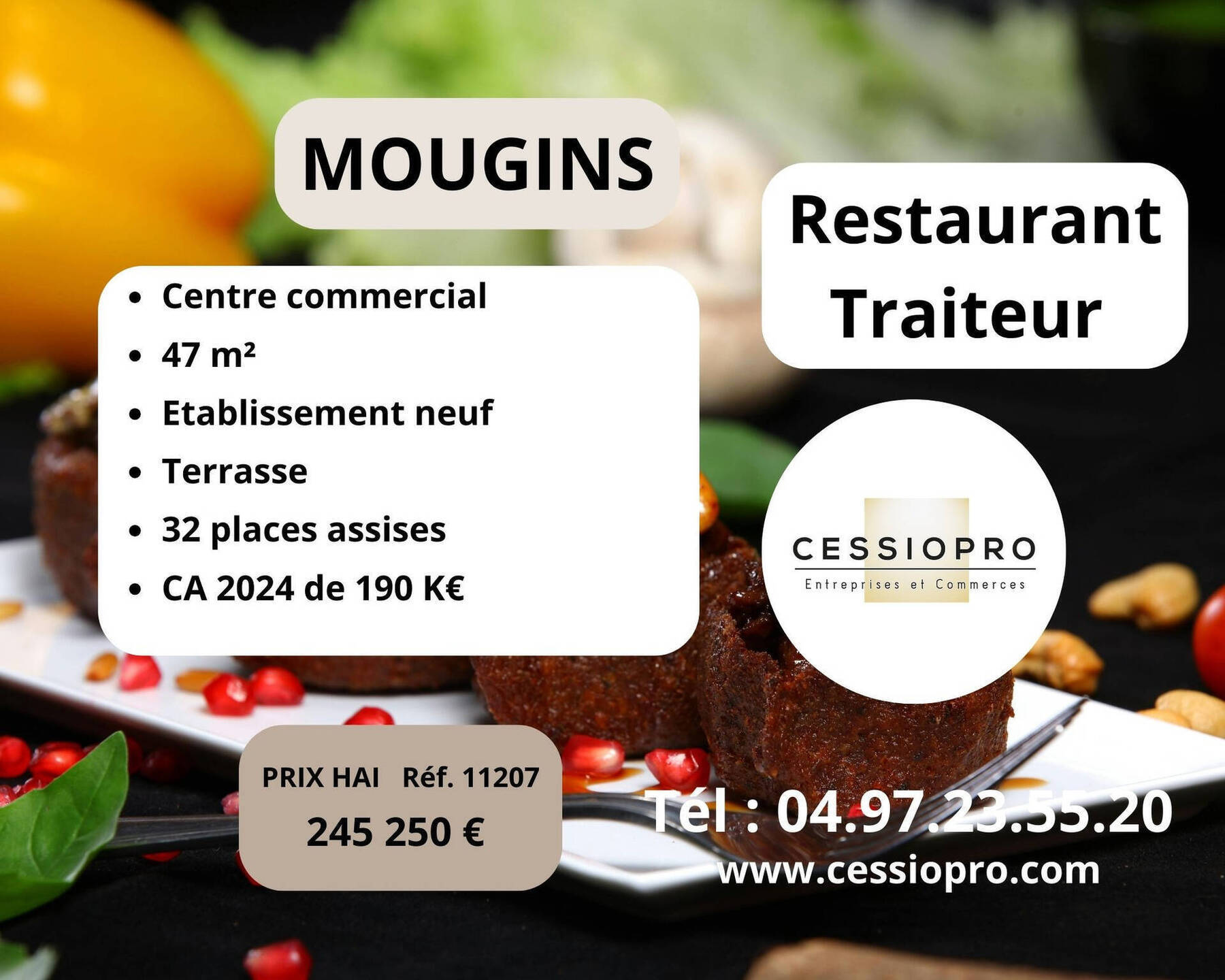 Eléments financiers : 225 000 € net vendeur 245 250 € honoraires du cabinet Cessiopro inclus Honoraires à charge de l’acquéreur de 9 % TTC soit 7.50 % HT Honoraires fixes à la charge de l’acquéreur de 20 250 € TTC ou 16 875 € HT