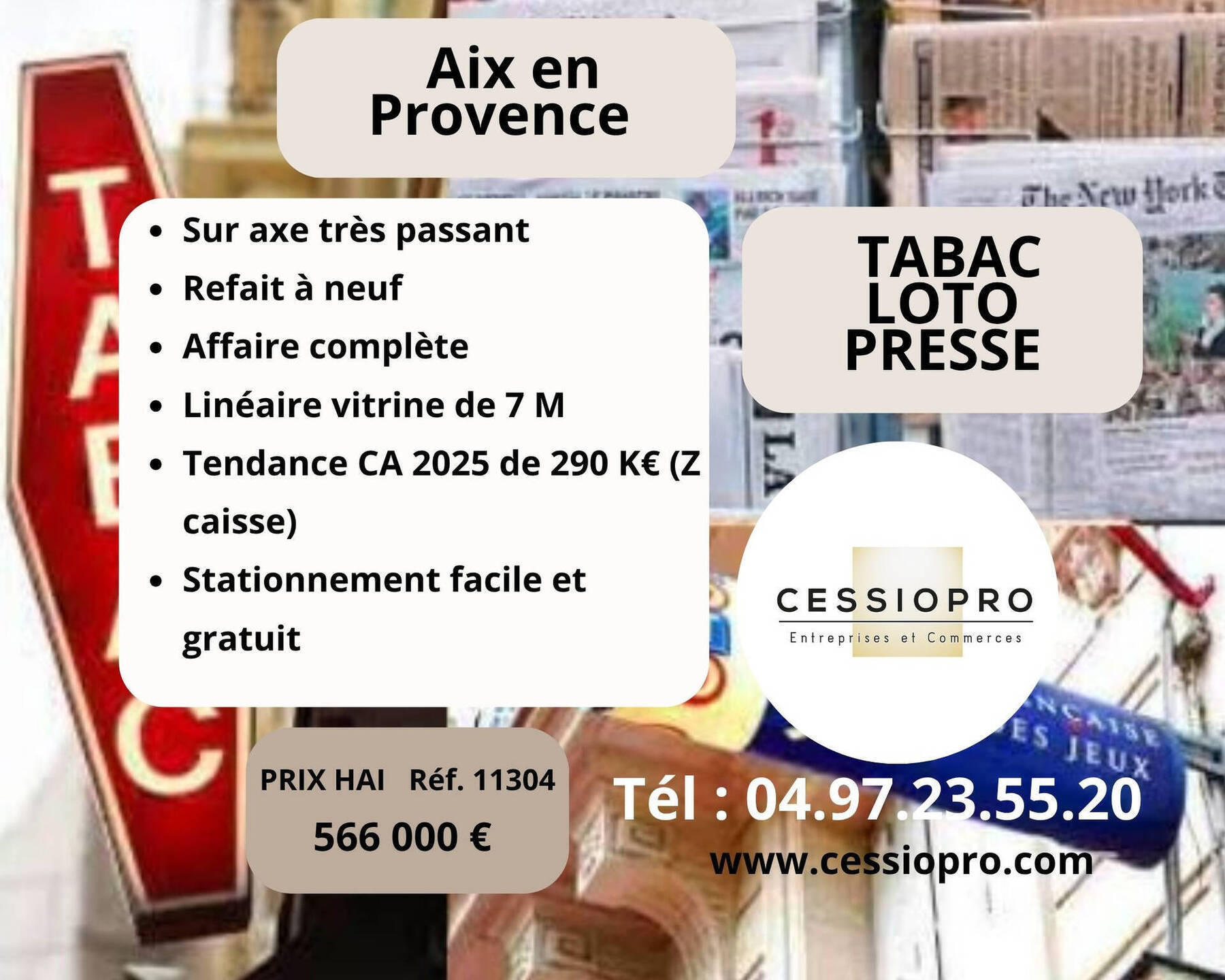 Aix en Provence : Tabac Loto PMU Presse Bimbeloteries Relais Colis Multi Services… Affaire Complète et Rénovée Belle superficie commerciale et belle visibilité, Située sur un axe très passant Avec stationnement facile et gratuit Tenue par un couple d’exploitants Fermée tous les soirs à 19H, ouverte 80H/semaine Loyer : 1 590€/mois Total CA Net 2024 : 292 000€ (Tendance CA 2025 sur Z de caisse identique) Totales commissions Nettes 2024 : de 160 000€ (Tendance 2025 sur Z de caisse identique) EBE Retraité 2024 : 176 000€ (pour un couple d’exploitant à la reprise, 166 000€, si salarié Mi-temps en sus…) Prix de vente Net Vendeur : 520 000€ Honoraires du Cabinet de 9 % TTC, (soit 7,5% HT) à charge de l’acquéreur.