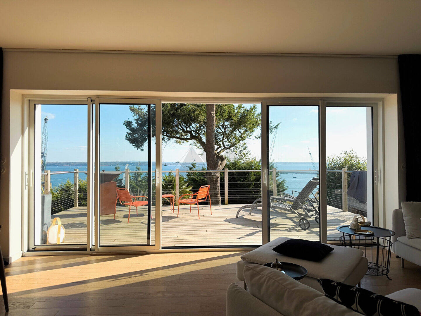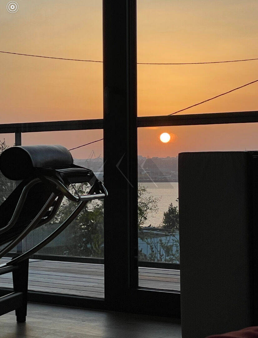 Dès l'entrée, le rez-de-chaussée s'ouvre sur une vaste pièce de vie baignée de lumière, tournée vers la rade et prolongée par une agréable terrasse. La cuisine spacieuse et entièrement équipée, s'intègre harmonieusement à cet espace convivial. Un wc complète ce niveau.